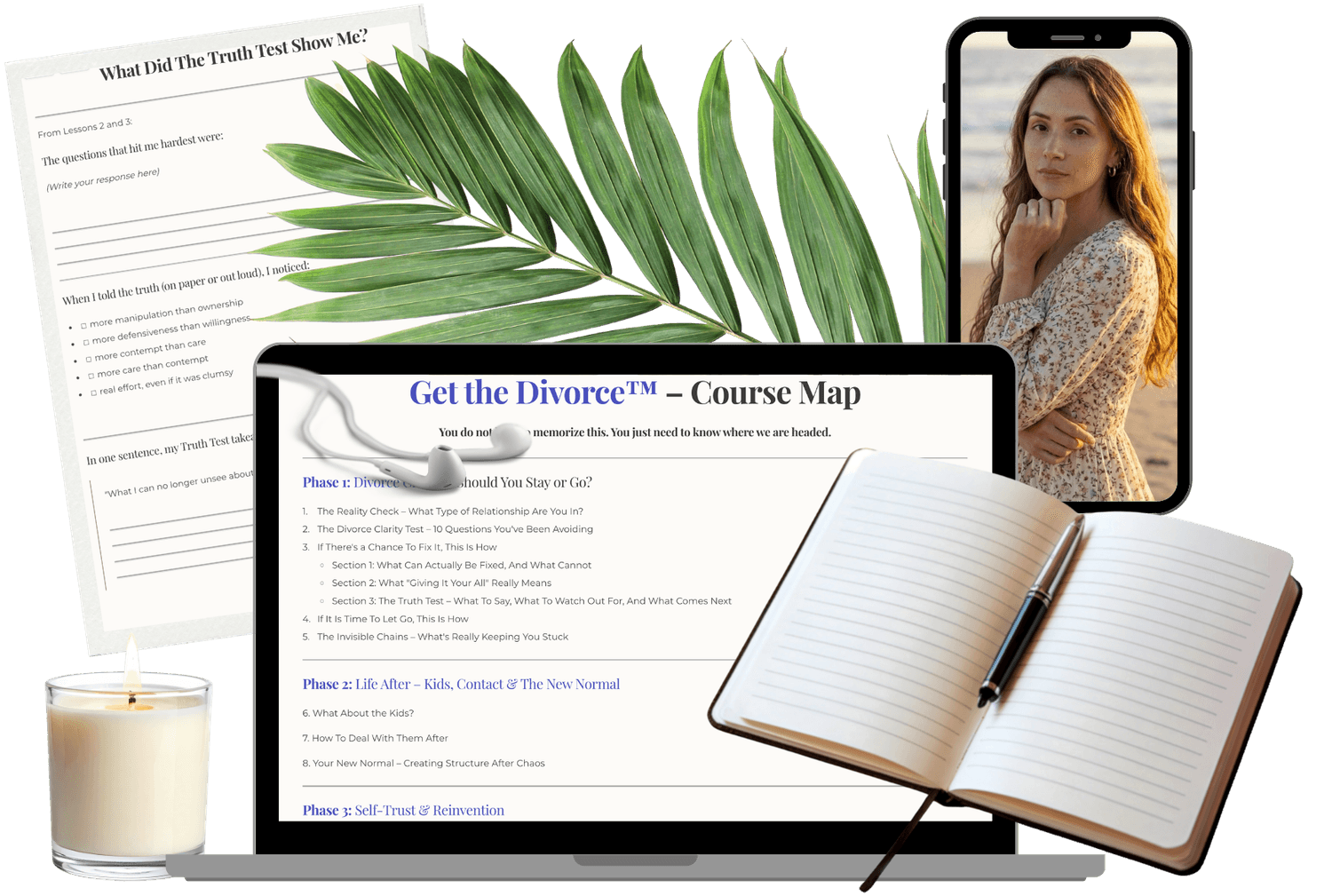 Get The Divorce™ is a self-paced clarity coaching course, not therapy or legal advice. The “hypnosis” part is just gentle guided audios to help your nervous system calm down so you can think clearly. You’re fully in control the entire time.